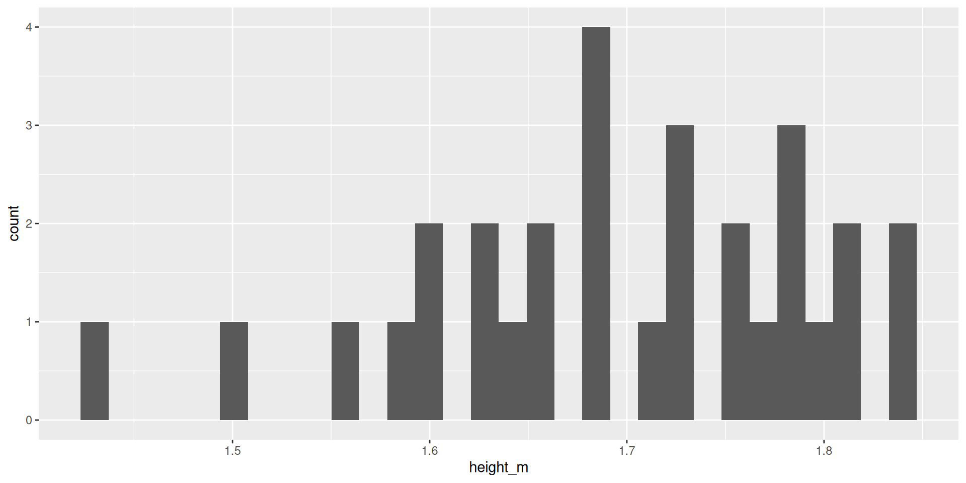 # Plot distribution using tidyverse# 'Send' the heights tibble to ggplot()histogram_fancy <- heights |>ggplot(aes(x = height_m)) +geom_histogram()# Show the histogram on the screenhistogram_fancy # or print(histogram_fancy)
