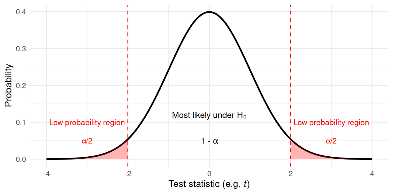 If our test statistic falls in the red region (p < 0.05), we reject H₀.