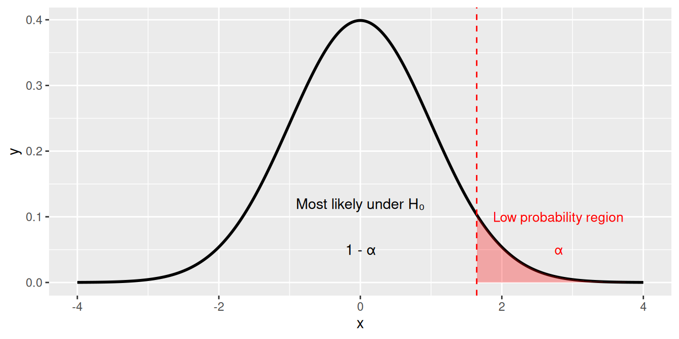 If our test statistic falls in the red region (p < 0.05), we reject H₀ in favour of the directional alternative.