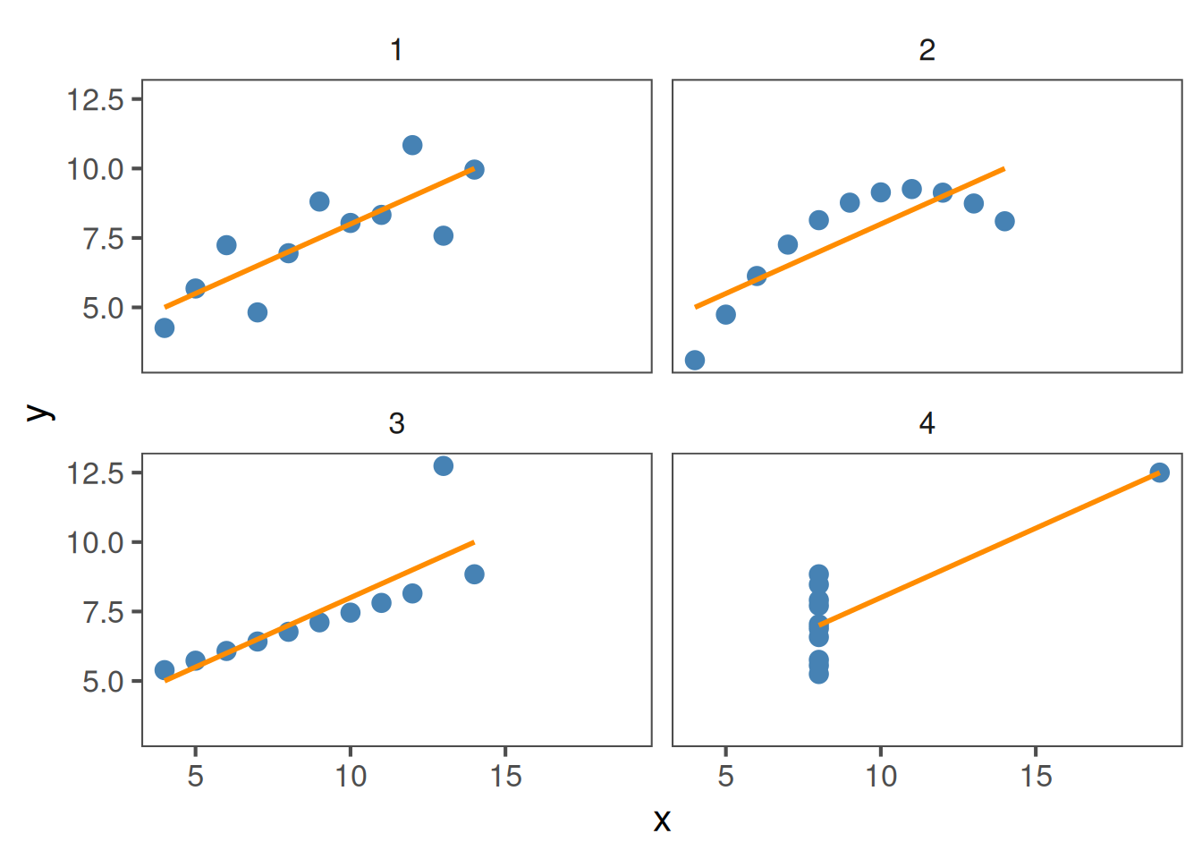- Visualise first — avoid being misled by non-linear patterns or outliers