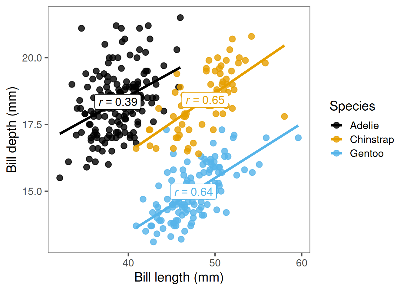 Perhaps we want to know if the strength of the correlation differs between species. We can do this using group_by(species) and summarise() from the tidyverse, just like we did previously for means: